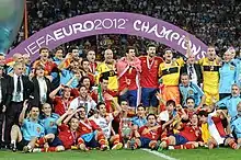 La Roja commence le tournoi européen en Pologne par un match nul avec l’Italie (1-1) suivi d'une victoire sur l’Irlande (4-0). Affichant une fébrilité étonnante, elle parvient toutefois à se qualifier pour les quarts de finale en battant la Croatie (1-0)[52]. Elle bat la France (2-0) au bout d'un match fermé, puis est accrochée en demi-finale par le Portugal (0-0 ap). L'Espagne doit s'en remettre aux tirs au but (4-2) pour jouer sa deuxième finale consécutive de championnat d'Europe. Elle retrouve en finale l'Italie, qu'elle écrase cette fois 4-0. Le score face à l'Italie constitue le plus gros écart de buts dans une finale européenne ou mondiale. La Roja, première sélection à conserver un titre européen, signe un triplé Euro-Mondial-Euro inédit dans l'histoire du football[53].