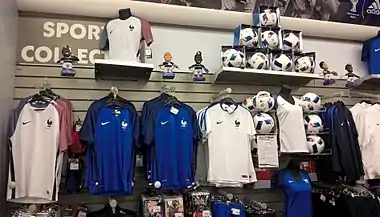 Pendant l'Euro 2016, l'équipe de France porte un maillot confectionné par l'équipementier Nike. Le maillot domicile comporte deux nuances de bleu, avec un ton plus foncé sur les manches que la couleur présente sur le reste de la tenue. Le maillot extérieur est plus original, reprenant les couleurs du drapeau national, avec le torse en blanc et les manches en bleu et rouge[7]. Il est vendu 140 € en version "authentique" et 80 € en version "replica"[8].