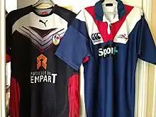 Notons que le maillot de l'équipe de France n'a pas échappé à la tendance des maillots treizistes d'abandonner rapidement le coton (qui présente l'inconvénient de s'alourdir lorsque le joueur transpire ou lorsqu'il pleut [33]) pour adopter rapidement le synthétique. Les équipementiers se sont également succédé au gré des années et des compétitions : Puma, Canterbury, Erreà.