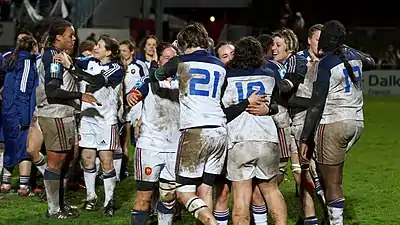 Dans le Tournoi des Six Nations 2018, les Bleues réussissent le Grand Chelem[10]. Dans la tournée d'automne, elles affrontent les Blacks Ferns de Nouvelle-Zélande, championnes du monde en titre. Le , à Toulon, les Françaises perdent le premier test par 0 à 14[11]. Mais, le , au stade des Alpes de Grenoble, elles prennent leur revanche sur la marque de 30 à 27[12]. C'est leur première victoire officielle[2] face aux Néo-Zélandaises. Ce mois-là, quatre Françaises figurent parmi les cinq femmes nommées par World Rugby pour le titre de joueuse de l'année : Pauline Bourdon, Gaëlle Hermet, Safi N'Diaye et Jessy Trémoulière[13]. Cette dernière remporte la récompense[14]. Toujours en novembre, 24 joueuses signent un contrat fédéral à mi-temps, qui doit leur permettre de libérer du temps pour améliorer leurs performances[15]. Dans le cadre de la tournée d'automne, le , les Bleues battent (38-13) en match amical les Black Ferns, championnes du monde en titre depuis 2017, au stade du Hameau de Pau. Une semaine plus tard, une deuxième confrontation est organisée au stade Pierre-Fabre de Castres où les Bleues battent encore les Black Ferns (29-7).