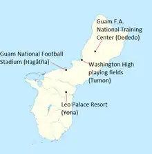 La sélection utilise successivement le Guam National Football Stadium et le Leo Palace Resort Soccer Ground de Yona et depuis 2014 le Guam F.A. National Training Center (en) à Dededo[note 13] Ce dernier stade accueille pour la première fois un match des éliminatoires de la Coupe du monde de football, contre le Turkménistan, se soldant par une victoire historique de Guam[44], devant 3 000 spectateurs, alors que le stade a une capacité de 5 000 places.