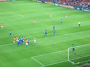 Marco van Basten, gloire néerlandaise des années 1980, prend les rênes de l'équipe nationale en juillet 2004. Il décide de la rajeunir, donnant leur chance à Dirk Kuyt ou Robin van Persie au détriment des expérimentés Roy Makaay, Clarence Seedorf ou Edgar Davids. Il change également de style de jeu, passant du traditionnel 4–3–3 à une disposition en 4–2–3–1. Van Basten obtient des résultats en qualifications pour la Coupe du monde 2006, les Néerlandais remportant tous leurs matchs sauf deux résultats nuls contre la Macédoine[95]. Lors de la Coupe du monde 2006, les Pays-Bas passent le premier tour sans toutefois briller (victoires 1-0 sur la Serbie-et-Monténégro et 2-1 contre la Côte d'Ivoire et nul 0-0 avec l'Argentine) dans un groupe annoncé là aussi comme « groupe de la mort », les Néerlandais se classant deuxièmes derrière les Argentins, devancés à la différence de buts. En huitième de finale, le Portugal leur barre à nouveau la route sur le score d'un but à zéro[96]. Le match, haché par les fautes, est connu pour les nombreux cartons distribués par Valentin Ivanov. Un total de vingt cartons est sorti, seize jaunes et quatre rouges, deux pour chaque équipe[97]. Malgré les critiques entourant sa politique de sélection et le manque de jeu offensif de son équipe, Marco van Basten se voit offrir une prolongation de deux ans de son contrat par la fédération néerlandaise, le prolongeant jusqu'au mondial 2010. Ce choix est vu comme un vote de confiance des dirigeants de la KNVB en van Basten et ses assistants[98].