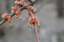Les fleurs sont unisexuées, les fleurs mâles et femelles se trouvant dans des inflorescences distinctes, sur le même arbre ou sur des arbres différents selon les régions. Les fleurs femelles (graines) sont rouges avec cinq pétales très petits. Les fleurs mâles (pollen) ne comportent que des étamines jaunes et sont portées par de courtes pousses sur les branches. La floraison commence tôt dans l'année, après une période de 1 à 30 jours à température croissante[3].