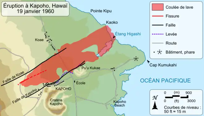 Une localité de 300 habitants, une école, des églises, des routes, des cultures ont été détruites et recouvertes par plusieurs mètres d'une lave qui s'est avancée en mer, modifiant le trait de côte en amenant notamment le cap Kumukahi, point le plus oriental d'Hawaï, un peu plus vers l'est[17]. Après le refroidissement de la lave, Kapoho n'est pas reconstruite, à l'exception de quelques bâtiments au sud-ouest de l'emplacement de l'ancienne localité, à côté de la coulée de lave[20]. Les routes sont retracées, la côtière traversant la coulée de lave de part en part et celle menant au phare du cap Kumukahi via Kapoho reprenant l'ancien itinéraire[20]. Une partie de la coulée de lave, notamment la masse de téphras formée le 27 janvier, est depuis exploitée comme carrière de scories non loin de Koaʻe[20].