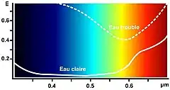 D'une part les particules en suspension dans l'eau de mer empêchent la lumière de passer, l'absorbant ou la réfléchissant. La quantité de ces particules définit la turbidité de l'eau et varie en fonction de nombreux paramètres du milieu. De manière générale, elle est plus élevée le long du littoral qu'au large, de par le lessivage des côtes et la mise en suspension du sédiment par les vagues.
