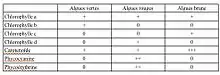 - équipement pigmentaire utilisé pour réaliser la photosynthèse (hypothèse de l'adaptation chromatique complémentaire selon laquelle les algues peuvent moduler le contenu pigmentaire de leurs antennes collectrices en réponse à des variations de la qualité spectrale de la lumière et de la quantité de lumière[10] à laquelle elles sont exposées) ;