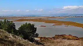 Le plan d'eau permanent est entouré de roselières, de sansouires et de prés salés périodiquement submergés[4].