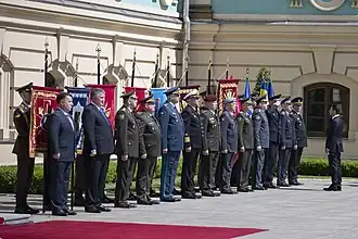 Le commandant en chef est secondé par le chef d'état-major général ainsi que par les commandants des différentes branches des Forces armées de l'Ukraine[2] :