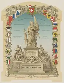 Dans le même temps, les trois premiers partis politiques nationaux se forment : le Parti socialiste suisse en 1870[44], le Parti radical-démocratique qui regroupe les partisans de l'État fédéral[45]et le Parti populaire catholique suisse (futur Parti populaire conservateur, puis Parti démocrate-chrétien)[46] en 1894.