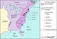 Au cours des XVIIe et XVIIIe siècles se forment progressivement les treize Colonies britanniques de la côte orientale, ancêtres des États-Unis (carte). La colonisation est assurée par des compagnies et un système de chartes. Les Français explorent la vallée du Mississippi et fondent la Louisiane. L'Amérique du Nord devient rapidement un enjeu entre les puissances coloniales : l'Angleterre (devenue la Grande-Bretagne en 1707 à la suite de son unification avec l'Écosse) assure peu à peu sa suprématie en remportant les guerres anglo-néerlandaises puis la guerre de Sept Ans (1763) contre la France, qui perd ses possessions de l'est du Mississippi (carte). Le peuplement se fait essentiellement par des migrants britanniques et par la traite négrière. Les esclaves noirs sont employés dans les plantations de tabac du sud mais aussi pour le développement des infrastructures. Vers 1775, les treize colonies sont prospères et comptent plus de deux millions d'habitants.