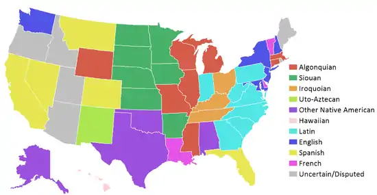 Les cinquante États des États-Unis tirent leur nom d'une grande variété de langues. La moitié des États, 25, ont un nom dérivé de langues amérindiennes : huit de l'algonquin, sept des langues siouanes (dont l'un via l'illinois, une langue algonquine), trois des langues iroquoises, un des langues uto-aztèques et cinq d'autres langues amérindiennes. Le nom Hawaï viendrait de l'hawaïen. Les autres noms dérivent des langues européennes : sept viennent du latin (principalement la forme latine de noms propres anglais), six viennent de l'anglais, cinq viennent de l'espagnol (plus un d'une langue autochtone via l'espagnol) et trois viennent ou pourraient venir du français (dont l'un via l'anglais) : Louisiane, Vermont et peut-être Maine.