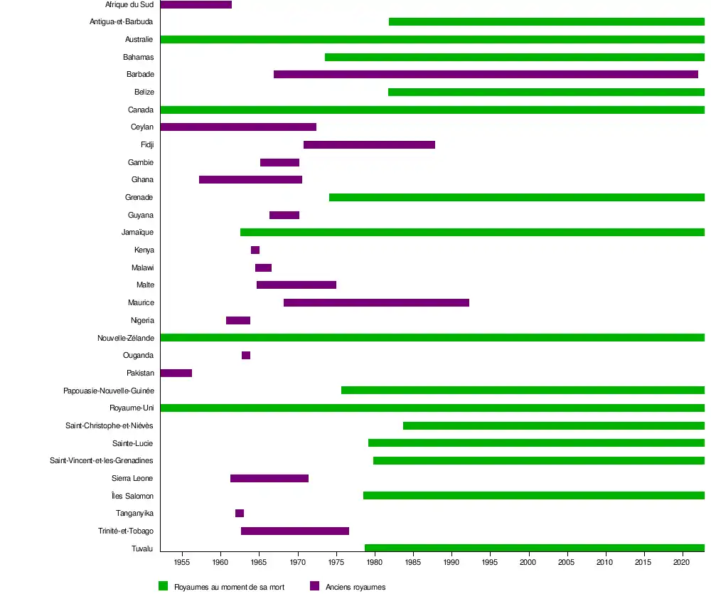 Avec 70 ans de règne, Élisabeth II détient le record de longévité sur le trône britannique et est l'un des monarques ayant régné le plus longtemps[19]. Elle a ainsi été le chef d'État de trente-deux royaumes du Commonwealth différents entre 1952 et 2022, représentés sur la frise chronologique ci-dessous :