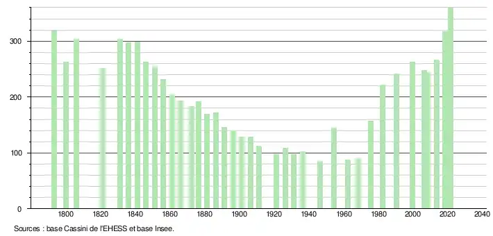 L'évolution du nombre d'habitants est connue à travers les recensements de la population effectués dans la commune depuis 1793. Pour les communes de moins de 10 000 habitants, une enquête de recensement portant sur toute la population est réalisée tous les cinq ans, les populations légales des années intermédiaires étant quant à elles estimées par interpolation ou extrapolation[14]. Pour la commune, le premier recensement exhaustif entrant dans le cadre du nouveau dispositif a été réalisé en 2008[15].
