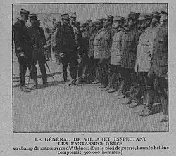 En , le général de Villaret devint chef de la Mission militaire française en Grèce, en remplacement du général Eydoux. Le général de Villaret quittait Commercy où il avait fondé une filiale de la Société des sciences, lettres et arts de Bar-le-Duc. C'est à Marseille que, le , il s'embarqua à bord de l'Équateur. Dès son arrivée à Athènes, il fut nommé au commandement effectif du 1er corps de l'Armée grecque. Au commencement de juillet, ses troupes avaient acquis un entraînement qui leur valait les félicitations officielles du roi Constantin et le , il recevait la croix de grand commandeur de l'Ordre du Sauveur.