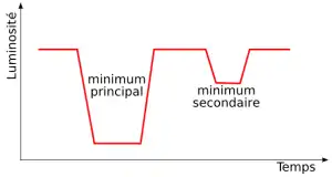 Le minimum d'éclat (minimum principal) survient lorsque l'étoile la plus brillante est partiellement cachée par la plus faible. Le minimum secondaire, qui peut ne pas être très visible dans certains cas, a lieu lorsque l'étoile la plus brillante obscurcit la plus faible.