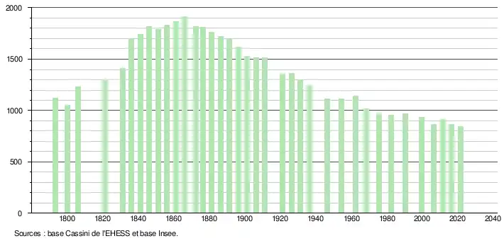 L'évolution du nombre d'habitants est connue à travers les recensements de la population effectués dans la commune depuis 1793. Pour les communes de moins de 10 000 habitants, une enquête de recensement portant sur toute la population est réalisée tous les cinq ans, les populations légales des années intermédiaires étant quant à elles estimées par interpolation ou extrapolation[25]. Pour la commune, le premier recensement exhaustif entrant dans le cadre du nouveau dispositif a été réalisé en 2006[26].