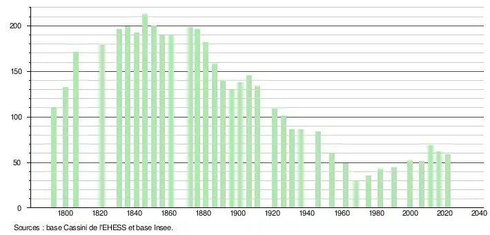 L'évolution du nombre d'habitants est connue à travers les recensements de la population effectués dans la commune depuis 1793. Pour les communes de moins de 10 000 habitants, une enquête de recensement portant sur toute la population est réalisée tous les cinq ans, les populations légales des années intermédiaires étant quant à elles estimées par interpolation ou extrapolation[16]. Pour la commune, le premier recensement exhaustif entrant dans le cadre du nouveau dispositif a été réalisé en 2006[17].