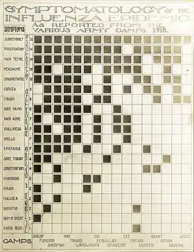 Tableaux statistiques (archives américaines) présentant les symptômes de l'épidémie de la grippe de 1918 tels que décrits par les médecins de différents camps de l'armée alliée en France.
