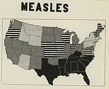 Epidémiologie de la rougeole ; cartographie pour les États-Unis de l'importance d'une épidémie de rougeole, sur la base des taux d'admission pour 1000 personnes/an d'hommes blancs enrôlés dans l'armée d'avril à décembre 1917 ; Archives médicales militaires américaines