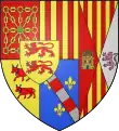Parti en senexte au I écartelé en 1 de gueules aux chaînes d'or posées en orle, en croix et en sautoir, chargées en cœur d'une émeraude au naturel, en 2 d'or aux trois pals de gueules, en 3 d'or aux deux vaches de gueules, accornées, colletées et clarinées d'azur, passant l'une sur l'autre et 4 d'azur aux trois fleurs de lys d'or à la bande componée d'argent et de gueules ; sur-le-tout d'or aux deux lions léopardés de gueules, armés et lampassés d'azur, passant l'un sur l'autre et en II écartelé en sautoir d'or aux quatre pals de gueules et de gueules au château d'or ouvert et ajouré d'azur et d'argent au lion de gueules armé, lampassé et couronné d'or. |