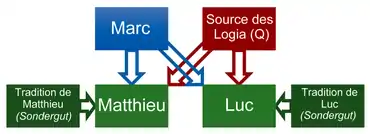 Selon la théorie des deux sources, admise par la quasi-totalité des chercheurs, les parties communes à Matthieu et à Luc dépendent à la fois de l'évangile selon Marc (600 versets chez Matthieu et 350 chez Luc) et d'un document perdu (235 versets présents chez Matthieu et Luc, mais absents de Marc) appelé la source Q[33].