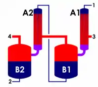 L'eau est bouillie dans une séquence de différents réservoirs, chacun maintenu à une pression inférieure à celle de la dernière. Parce que la température d'ébullition de l'eau diminue à mesure que la pression diminue, la vapeur d'eau portée à ébullition dans un seul réservoir peut être utilisée pour chauffer le prochain. Seul le premier réservoir (à la pression la plus élevée) nécessite une source externe de chaleur. Des évaporateurs avec plus de quatre étapes sont rarement utilisés.