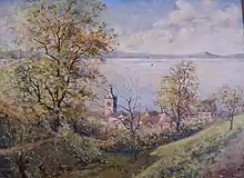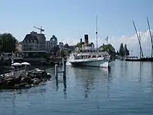 ![]() ![]() ![]() ![]() ![]() ![]() ![]() De haut en bas, de gauche à droite : Évian-les-Bains vue depuis le Léman ; Le Palais Lumière et l'hôtel de ville d'Évian ; Le Casino d'Évian ; La Buvette Cachat ; L'Hôtel Royal d'Évian ; La promenade du port ; Le port d'Évian |