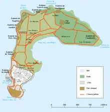 L'occupation des sols de la commune, telle qu'elle ressort de la base de données européenne d’occupation biophysique des sols Corine Land Cover (CLC), est marquée par l'importance des territoires agricoles (60,4 % en 2018), une proportion identique à celle de 1990 (60,4 %). La répartition détaillée en 2018 est la suivante : zones agricoles hétérogènes (60,4 %), forêts (37,5 %), zones humides côtières (1,5 %), eaux maritimes (0,6 %)[13]. L'évolution de l’occupation des sols de la commune et de ses infrastructures peut être observée sur les différentes représentations cartographiques du territoire : la carte de Cassini (XVIIIe siècle), la carte d'état-major (1820-1866) et les cartes ou photos aériennes de l'IGN pour la période actuelle (1950 à aujourd'hui)[Carte 1].