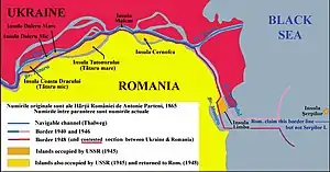 Le , le Premier ministre de la République populaire roumaine, Petru Groza, et le ministre des Affaires étrangères de l'URSS, Viatcheslav Molotov, ont signé à Moscou le « Protocole concernant la détermination du tracé de la frontière d'État entre la Roumanie et l'URSS », qui, bien qu'invoquant le traité de paix de Paris de 1947, le transgressait en déplaçant la frontière, sur environ un tiers de la longueur du bras de Chilia, au sud du talweg navigable de ce bras, « laissant les îles de Coasta Dracului (Tătarul mic), Daleru Mic et Mare, Maican et Limba à l'URSS, et les îles Tataru Mare, Cernofca et Babina à la Roumanie ; l'île des Serpents, située en mer Noire, à l'est des bouches du Danube, est intégrée à l'URSS », la frontière traversant le golfe de Musura vers la mer Noire à l'est. En revanche, les îles de Tatomir (Tătarul mare ou Tatanir) et Cernofca, également occupées par l'URSS en 1944, sont rendues à la Roumanie, les gardes-frontières soviétiques s'en retirant.