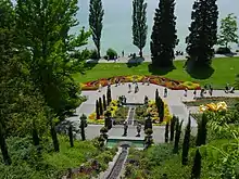 Dans la période transitoire de mai à juin, fleurissent plus de 200 rhododendrons et autres variétés d’azalées. Le jardin aux roses, dessiné dans le style italien, est une conception strictement géométrique comprenant des pergolas, des sculptures et des fontaines. En été, le jardin aux roses est baigné dans le parfum de ses plus de 500 variétés de roses ; 30 000 rosiers de 1200 variétés différentes recouvrent l’île. L’allée du printemps mène à la terrasse méditerranéenne ornée de plantes exotiques en pot telles que des palmiers, des cactus, des bougainvilliers et des agaves. De cette terrasse, la vue sur le paysage du lac de Constance et des Alpes est imprenable. En juillet fleurissent les brugmansias et les hibiscus, en août s’ajoutent les passiflores.