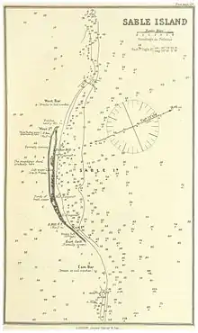 L'île de Sable est une barre de sable en forme de croissant longue de 42 km, mais dont la largeur ne dépasse pas 1,3 km[3]. Elle a une superficie d'environ 3 100 ha[4]. Elle émerge d'une vaste zone de haut et bas-fonds du plateau continental.