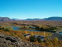 Vue de la partie septentrionale des Þingvellir depuis le rebord sud-ouest du horst avec au premier plan la Öxará, dominés à droite par la Hrafnabjörg ; à gauche au dernier plan se trouve le Skjaldbreiður. | ||