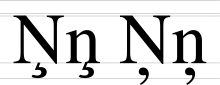 Les caractères Unicode du N cédille ‹ ņ › sont utilisés en letton pour représenter le N virgule souscrite ‹ n̦ › qui retranscrit la consonne nasale palatale voisée [ɲ]. Sa cédille ressemble à une virgule souscrite.