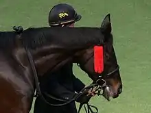 Les œillères australiennes, spécifiques aux courses de plat, consistent en une peau de mouton ajoutée au montant de la bride.