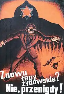 Propagande polonaise du temps de la guerre Guerre soviéto-polonaise, (1920-1921), « Pions des juifs encore ? Jamais ! » ciblant les citoyens orthodoxes de Pologne dans les territoires de l'Est.