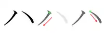 - Trait diagonal, tracé de gauche à droite, à droite du premier.
