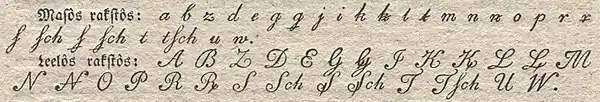 En letton, Georg Mancelius (en) utilise le s barré dans son orthographe dans Lettisch Vademecum ou dans le dictionnaire Lettus, das ist Wortbuch publié en 1631-1641[2]. Johann Georg Rehehusen le mentionne dans la première grammaire lettone, Manuductio ad linguam lettonicam, publiée en 1644 à Riga[3]. Johann Ernst Glück utilise le s barré dans Tā Svēta Grāmata, la première traduction de la Bible en letton publié en 1689[4].