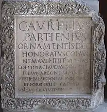 Le H dimidié à droite dans le mot PART⊣ENIUS, « Parthenius » sur la deuxième ligne d’une inscription épigraphique du Musée Archéologique de Nîmes.
