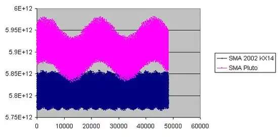 L'évolution du demi-grand axe de Pluton (rose) et de (119951) 2002 KX14 (bleu).