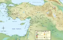 - Printemps, Asie mineure : Nicomède IV de Bithynie, poussé par le légat Aquilius qui vient de le rétablir sur son trône, ravage la Paphlagonie pontique pour payer ses protecteurs romains, ce qui déclenche la première guerre de Mithridate[4]. Mithridate VI, roi du Pont, après l’échec de négociations avec Rome, occupe la Cappadoce pour y rétablir son fils Ariarathe IX, et après deux victoires décisives, l'une sur Nicomède sur la rivière Amnias, l’autre sur Aquilius à Protopachion, occupe la Bithynie[5].