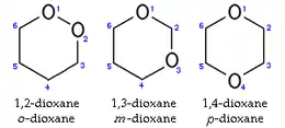 Le 1,4-dioxane est l'un des trois isomères du dioxane. C'est un solvant fortement suspecté d'être cancérigène chez l'homme et cancérigène avéré sur le rat. Il a été très utilisé, et notamment ajouté à certains solvants chlorés, dans la seconde partie du XXe siècle, pour les rendre plus stables. Il peut contaminer les nappes phréatiques et l'eau (tout en dégradant ses qualités organoleptiques)[10].