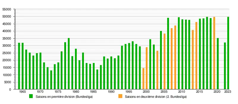 Évolution de la moyenne de spectateurs à domicile du 1. FC Cologne[26],[27]