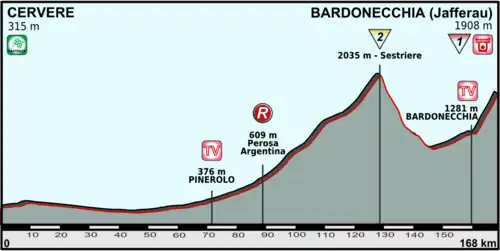 En raison des mauvaises conditions météorologiques (neige), la montée sur Sestrières (2e catégorie, km 125) a été annulée. Le parcours est modifié de manière à rejoindre directement la montée finale sur Bardonèche. En conséquence, l'étape est rallongée à 180 km au lieu des 168 km initialement prévus[1].