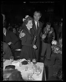 Gary Cooper et Joan Fontaine tenant leurs Oscars lors de la réception suivant la cérémonie.