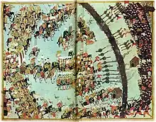 - 5 avril, affaire de Clissa[14] : Clissa (Klis), petite place turque sur l’Adriatique, est prise par les corsaires Uscoques par traîtrise en février. Les Turcs doivent mobiliser les moyens nécessaires à la guerre de Hongrie pour reprendre la ville (), au moment où les Impériaux et le pape essayent d’entraîner Venise dans la guerre, où des troubles multiples se produisent dans les domaines Vénitiens de Dalmatie et où le duc d’Olivares, vice-roi de Naples, tente de soulever l’escale de Spalato, qui assure le relais entre Venise et le commerce terrestre avec les Balkans depuis 1591.