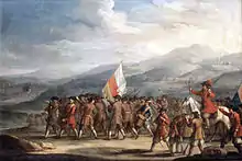 - 4 juillet : Le Quesnoy, défendue par 2 000 hommes, se rend après un siège de quinze jours[23]. Les deux tiers de la garnison ont pu s'échapper avec leur chef, le gouverneur La Badie, que Louis XIV fait emprisonner à La Bastille, considérant cette fuite comme une désertion[24].