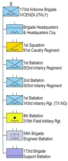 La 173rd Airborne Brigade comprenait alors une compagnie de commandement, une compagnie de reconnaissance, deux bataillons d’infanterie aéroportée, une batterie d’artillerie, un détachement du génie et un commandement du soutien :