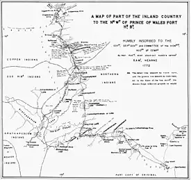 Une carte d'exploration réalisée par Samuel Hearne en 1772 montrant les régions au nord-ouest du fort Prince-de-Galles à la baie d'Hudson
