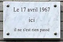 - 1967 : plaque faussement commémorative poétique et/ou humoristique absurde voire satirique « Ici, le 17 avril 1967, il ne s'est rien passé » apposée 52 rue de Charenton à Paris 12e[6] (voir photographie ci-après in fine).
