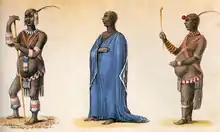 Le roi Dingaan en tenue ordinaire et d'apparat. Gravure de Allen Francis Gardiner, 1836.